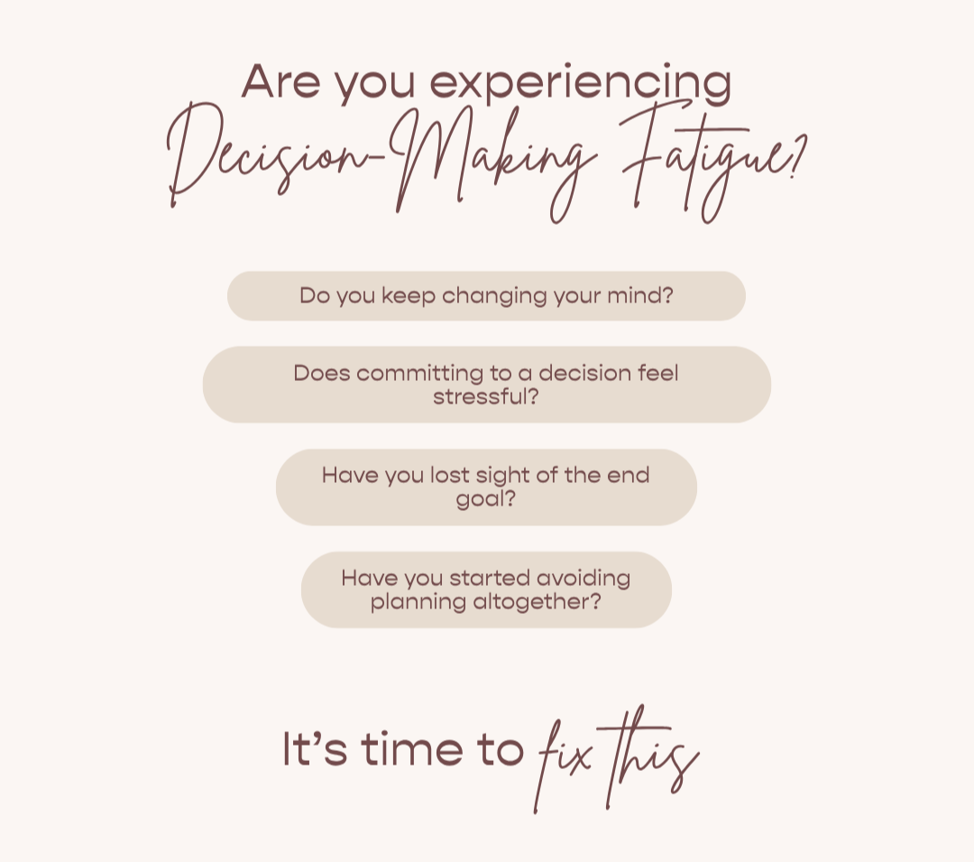 When we have too many choices, it overwhelms our brains and we spend longer feeling scrambled in the decision-making process. Every decision we have to make takes up energy and wedding planning requires hundreds of small (and large) decisions to be made in quite a short space of time.